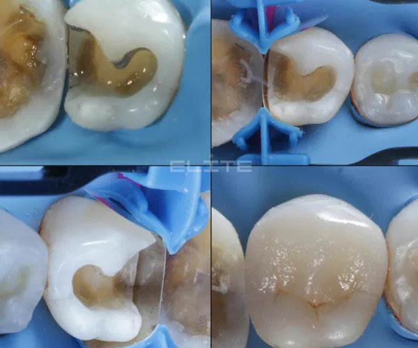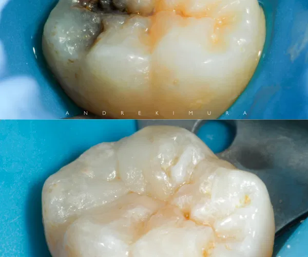 Nos dentes posteriores, a prioridade é remover a cárie e restaurar a função mastigatória com materiais que suportem esforços contínuos, mantendo um aspecto estético condizente com a anatomia do dente em questão.